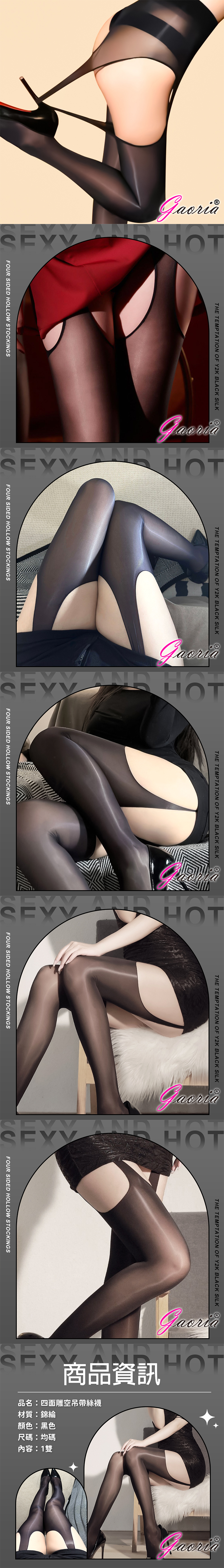 品名:Gaoria|魅惑誘惑 四面雕空油亮吊帶絲襪 黑